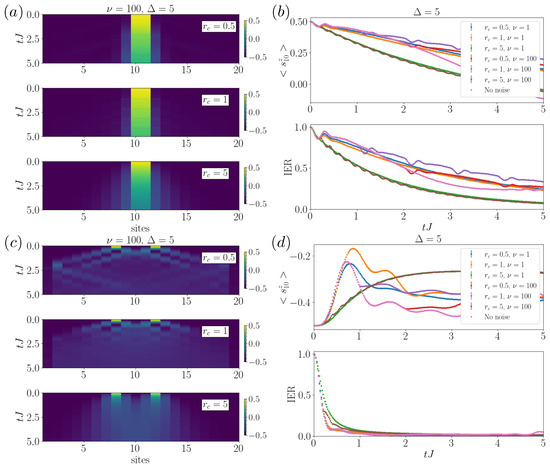 Since spatial separation of the excitations would drastically reduce their likelihood of interfering, we consider the generality and robustness of these results by initially placing them at a fixed distance (see Figure 4c,d). In Figure 4c, we observe that noise can prevent the certain destructive interference that appears due to coherence in the absence of noise (or small ). In this case, noise enhances the spreading in the central part of the system. This could be useful in engineering irregular architectures beyond linear chains, to prevent interference effects. By analyzing the magnetization and IER in Figure 4d, no important differences are observed by increasing , apart from a small slowdown of the spreading, in fact regaining a similar behavior of the single excitation case but with a smaller impact from noise. We note that, unlike the case with two neighboring excitations, where the transport was mostly prevented due to the anisotropy, here we observe differences with . In particular, an increase in the collision rate quite rapidly breaks the coherence-driven oscillations, mostly independently of the noise time-homogeneity.