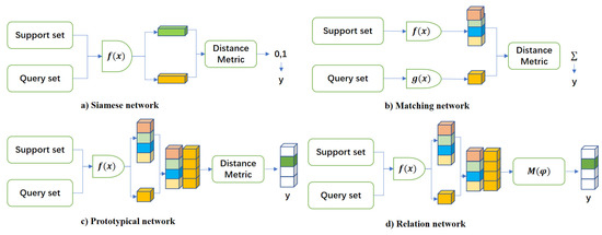 Few-shot learning based on metric methods aims to classify samples by measuring their similarity. To achieve this, metric networks first extract sample information using an embedding layer and train a metric function that maps similar samples to a closer space and dissimilar samples to a more distant space. Siamese networks [19], prototypical networks [20], and relation networks [21] are some of the classical methods used for this purpose. Siamese networks rely on feature vectors obtained from neural networks and use Euclidean distances to calculate similarity. Recently, many scholars [22,23,24] have also proposed new models based on Siamese networks for fault diagnosis applications. Prototypical networks create a prototype representation for each classification based on a limited number of labeled samples, and the distance between the prototype vector and the query point of the classification is used to determine classification. Many recent studies [25,26,27] have used Prototypical networks to learn feature mappings for fault diagnosis with limited samples. For example, Chen et al. [28] proposed MoProNet for addressing cross-domain few-shot rotating machinery fault diagnosis. MoProNet employs a progressive update strategy for the support encoder to resolve prototype oscillation issues, thereby enhancing network performance. Relation networks (RNs) obtain feature vectors through multiple convolution layers and analyze the degree of matching by building a neural network to calculate the distance between two samples.
