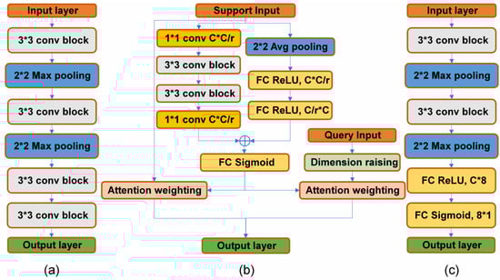 As illustrated in Figure 1, compared to Siamese networks and prototypical networks, relation networks can provide a non-linear classifier M φ that can learn relationships more accurately. Dynamic evaluation functions are better than static evaluation functions in time series anomaly detection, and a non-linear representation can evaluate relationships more accurately, making relation networks more effective for fault signal analysis [9]. Therefore, in this study, relation networks were selected for classifying and analyzing the fault dataset. The proposed attention-weighted relation network in this paper builds upon the foundation of the relation networks. Through the incorporation of an attention-weighted method, the overall system performance is enhanced, leading to improved classification effectiveness. The common definitions in relation networks are shown in Table 2.