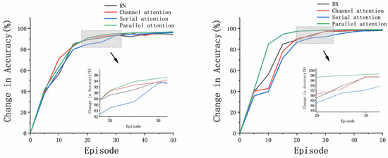To improve the accuracy of the network, we propose adding a parallel attention-weighted network behind the feature network. The utilization of the parallel attention mechanism proves effective in strategically emphasizing dynamic trends within time series data, facilitating the identification of anomalies and mutations. Concurrently, this mechanism enables the model to concentrate on distinct portions of the data across various scales. Specifically, for a given support feature f s R k × H × W , we use the attention module M f s R k × H × W to infer a three-dimensional weight vector that is then applied to both the support features f s and the query feature f Q R 1 × H × W . Here, we demonstrated that the attention-weighted method, when using the support feature, outperforms the method that relies on the query feature, as evidenced by subsequent experiments. This process results in a special weighting architecture with new weighted support features f S and query features f Q , which are calculated as follows [37]: