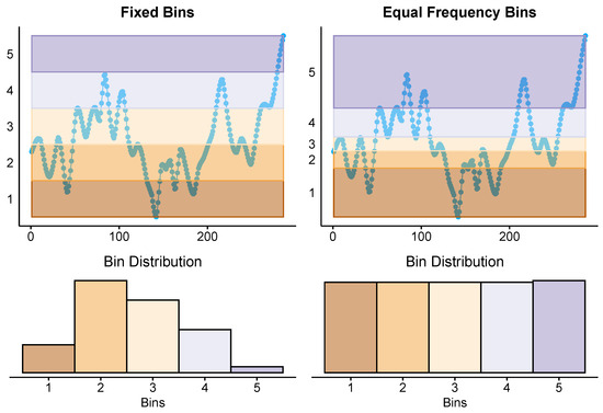 Fixed bin discretization consists of splitting the range of observed values in the time series into n equal-size intervals, where n is a user-supplied parameter [5]. Discretization by equal frequency bins involves dividing the range of observed values in the time series into n intervals, each containing a comparable number of data points. This is achieved by sorting all values in ascending order and then distributing them into n disjoint sets, each containing approximately the same number of elements [20].