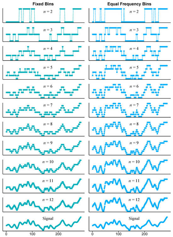 Comparison of the original MCAv signal from a healthy subject (bottom) with its discretized versions using fixed bins (left) and equal frequency bins (right). The number of bins ranges from 2 to 12 (from top to bottom).