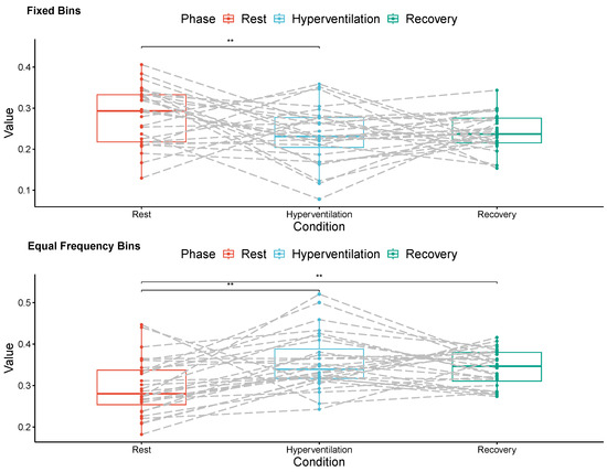Within the right hemisphere, higher mean values of conditional transfer entropy gauged with equal frequency bin discretization were also observed during hyperventilation (, 20.3% increase) and recovery (, 15.2% increase) than in the resting phase (). In this hemisphere, fixed bin discretization yielded higher mean values of conditional transfer entropy during the rest phase () than during hyperventilation (, 16.9% decrease).