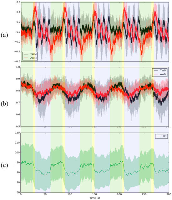 The comparison of HR and IE of TWM (black line) and AWM (red line) during each stage before and after the IVM trial. (a) HR (green line: before IVM; blue line: after IVM), (b) the IE before IVM, and (c) the IE after IVM. The yellow arrow shows the difference between IE of TWM and IE of AWM after IVM. The orange vertical line shows the point in time when the IE of AWM changed from larger (smaller) to smaller (larger) than the IE of TWM and black arrows indicate the movement of orange vertical line before and after IVM. The black and red lines are moving averages of the series of the mean IE. The shaded area means one standard deviation from the mean of all subjects.