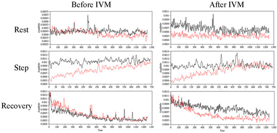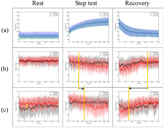 Figure 2 indicates the influence of the IVM trial. Figure 2a revealed that the HR after the IVM trial during resting was a little bit larger than the HR before the IVM trial. However, the HR did not show a significant difference between before and after the IVM trial during the step test and recovery. During rest, the IE of AWM was similar to the IE of TWM (Figure 2b) before the IVM trial, but after the IVM trial, the IE of AWM was larger than the IE of TWM. During the step test, compared with before the IVM trial, the IE of AWM was larger than the IE of TWM for a longer time from the exercise start (see the orange line in Figure 2b,c during the step test). During recovery, compared with before the IVM trial, the IE of AWM was smaller than the IE of TWM only for a short time from the start of recovery (see the orange line in Figure 2b,c during recovery).