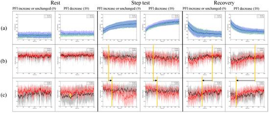 Figure 3b,c indicate the influence of the IVM trial on the IE of AWM and TWM. Though the trends of IE of AWM and TWM before and after the IVM trial were similar to those in Figure 2b,c where IE of AWM tends to be larger than IE of TWM, the influence of the IVM trial seems to be weaker in the group with a PFI increase or unchanged than the group with a PFI decrease. During rest, the IE of AWM was larger than the IE of TWM after the IVM trial compared with before the IVM trial in both groups (the double-headed arrow in Figure 3). During the step test, the timing of IE of AWM being smaller than IE of TWM was later in both groups after the IVM trial, but this effect is not significant (the moving of the orange line is short in Figure 3b,c during the step test). During recovery, the timing of IE of AWM being smaller than IE of TWM was earlier in both groups after the IVM trial; this effect in the group with a PFI decrease is stronger than that in the group with a PFI increase or unchanged (the moving of the orange line is longer in the group with a PFI decrease compared with the group with a PFI increase or unchanged).