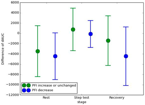 Figure 4 represents the result of the difference in dAUC between before and after the IVM trial in the two groups. Though the difference in dAUC in the group with a PFI decrease was smaller than the group with a PFI increase of unchanged in each stage, no statistically significant differences were found.