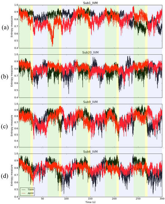 In addition, though in Figure 1, during the IVM trial, the average IE had the trend that the IE would be larger during spontaneous breathing, decrease during inhaling deeply, and the IE of AWM had a larger value than the IE of TWM during holding breathing, we need to acknowledge that not all subjects had this trend. Four interest cases were selected, for example. Figure 5a shows a case that did not have a similar trend compared with Figure 1b. In this subject, the IE of AWM dropped significantly during the early IVM trial. However, during the later IVM trial (after 150 s), the IE of AWM returned to be larger than the IE of TWM. This situation may be due to the fact that the subject was not familiar with the procedure of the IVM trial. After becoming familiar with this subject, a trend emerged. For Figure 5b, most of the time during the IVM trial, the IE of AWM was larger than the IE of TWM. It is possible that the subject is already used to breathing through the abdomen. In Figure 5c, although the IE decreased while holding the breath, which is similar to Figure 1b, the IE of AWM was not greater than the IE of TWM in the IVM trial. This may have been caused by a training failure. The subject had not learned how to breathe with the abdomen. Figure 5d is a standard example of a trend similar to the one in Figure 1b. Though these inferences still need to be verified, the IE provides valuable insights into the use of respiratory muscles. Furthermore, the IE is available to indicate very high temporal resolution; it is suitable to apply in precision medicine to customize personal health care guidelines.