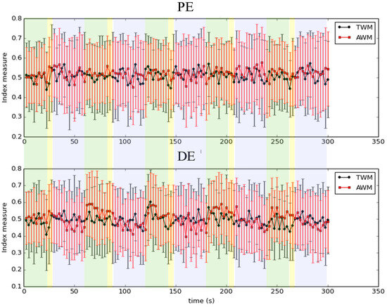 Since the IE has the particular property that it does not need to set the size of the time window or the ratio of overlapping for entropy computation, directly comparing the result of the IE with other conventional entropy methods is not appropriate. Nonetheless, we computed some conventional entropy of TWM and AWM during IVM for reference. Note that since the time complexity of SampEn is too large, the permutation entropy (PE) [45] and dispersion entropy (DE) [18] were applied here. The size of the time window was 625 points, which was 2.5 s. The overlapping ratio was set to 0%. Figure 6 indicates the result. To indicate the effect of TWM and AWM in three steps during the IVM trial by PE and DE is not significant, which may be caused by the inappropriate setting of the size of the time window and the ratio of overlapping. The setting of these two parameters is usually a critical issue in conventional entropy methods. In contrast, the IE does not need to set these two parameters. This property makes IE useful to indicate the intrinsic information within a time series.