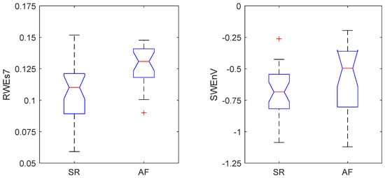 Box-plot distribution of the standard deviation of the relative wavelet energy at the 7th scale, , and the stationary wavelet entropy variability, , obtained for patients enrolled in the study who maintained sinus rhythm (SR) and those who relapsed into atrial fibrillation (AF) one year after the Cox–Maze procedure.