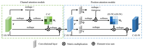 - Fu, J.; Liu, J.; Tian, H.; Li, Y.; Bao, Y.; Fang, Z.; Lu, H. Dual Attention Network for Scene Segmentation. In Proceedings of the 2019 IEEE/CVF Conference on Computer Vision and Pattern Recognition (CVPR), Long Beach, CA, USA, 15–20 June 2019; pp. 3141–3149. [Google Scholar] [CrossRef]
