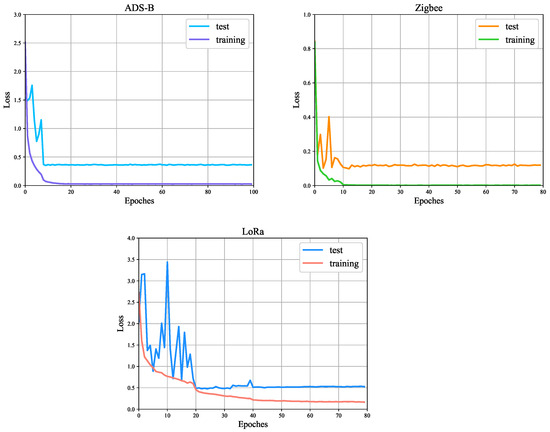 ADS-B: An ADS-B signal contains geo-coordinates, velocities, altitudes, headings, as well as the unique identifier information of the commercial aircraft. They are easy to receive and decode but are subject to identity spoofing attacks. We used the public dataset found in [42], for which the raw I/Q data of the signals were obtained at a sampling rate of 8 MHz and with a 1090 MHz center frequency; we generated 40,000 DCTFs in 100 subordinate categories and included 32,000 images for training and 8000 images for testing.