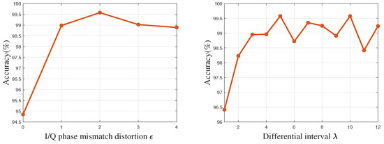 Figure 6 illustrates the accuracy of FGRFNet under various DCTF generation parameters when the SNR is 25 dB and the DCTF size is . As shown in Figure 6, the left plot demonstrates the impact of varying on the accuracy of the model when is fixed at 10. It can be observed that setting to 0 leads to a significant decrease in accuracy, while for greater than 1, the overall accuracy consistently remains above 98%. Particularly, the best performance is achieved when is set to 2. The right plot depicts the influence of different values on the model’s accuracy when is held constant at 2. It is evident that setting extremely short differential intervals leads to a significant drop in accuracy. However, when exceeds 3, the overall accuracy consistently surpasses 98.5%. Notably, the optimal performance is observed when is set to 10.