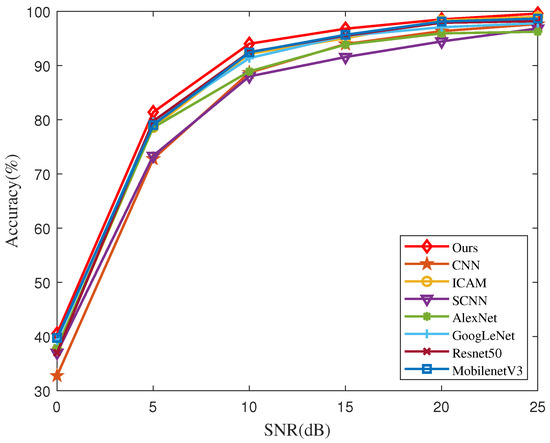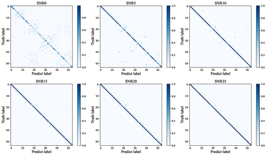 In order to evaluate the influence of SNR on RF fingerprinting recognition, we also carried out experiments under different SNR levels in the range of [0, 25] dB at a step of 5 dB using the Zigbee dataset. Figure 8 draws the accuracy curves using CNN [33], SCNN [51], AlexNet [46], GoogLenet [46], ResNet-50 [25], ICAM [45], MobileNetV3 [49], and our method for different SNR levels. It can be seen that as the SNR decreases, all the accuracies degrade. The performance deteriorates substantially, especially when the SNR is lower than 15 dB. But FGRFNet achieves an overall higher accuracy than other methods. In particular, when the SNR is lower than 15 dB, FGRFNet exhibits a performance advantage of approximately 10% over CNN. This indicates that FGRFNet is capable of effectively learning discriminative features and exhibiting greater robustness to noise. Figure 9 further displays the recognition confusion matrix of FGRFNet for different SNRs. With increasing SNR, the accuracy of RF fingerprint recognition is improved as well.