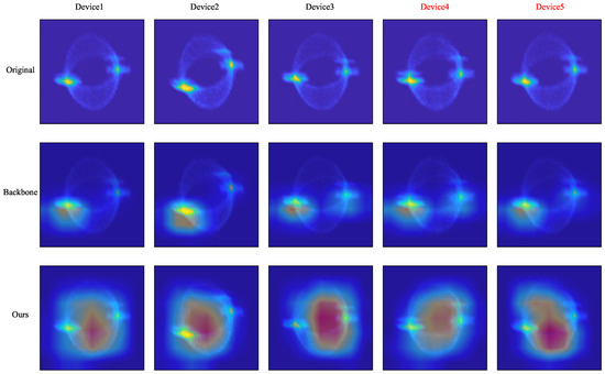 We adopt gradient-weighted class activation mapping (Grad-CAM) [52] to visualize and analyze the learned RF fingerprints to make our FGRFNet more interpretable. Grad-CAM generates heat maps that show the contribution distribution of the predicted output for input images. A higher score indicates a stronger response and greater contribution from the corresponding areas of the original image. This highlights the importance of each location to the class.