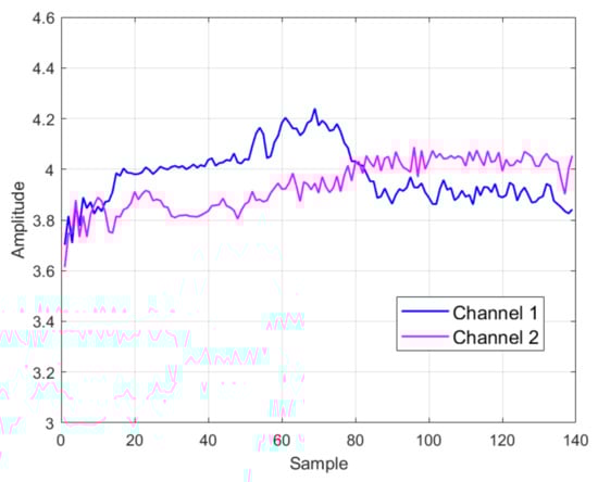 - Channel estimation and equalization. In our experiment, the UE worked in the 5G NR n78 frequency band, and hence the PRACH signals were affected by multipath channel fading. Least squares (LS) channel estimation and zero forcing (ZF) equalization techniques were applied to the signal to mitigate the influence of channel fading. The channel estimation can be expressed as [15]where x is the standard transmit signal. In our study, we selected the first and last 200 samples of the signal for channel estimation.