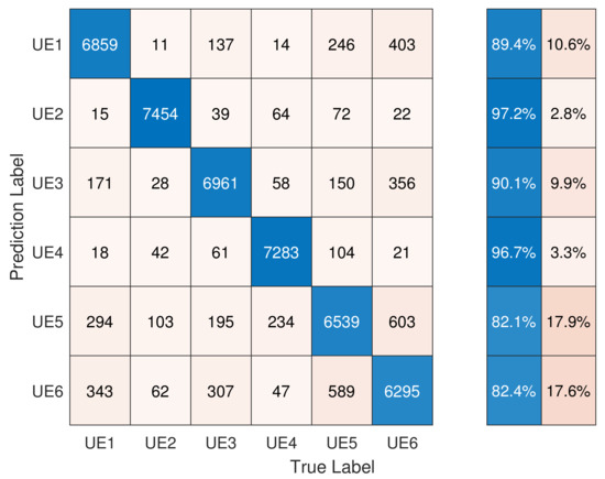 The classification results are presented in Figure 13. UE2 and UE4 showed an accuracy of around 99%. The high accuracy of these two devices was due to the fact that their models were different from the others. On the other hand, the other four devices belonged to the same model, and thus their RFF features were quite similar, which resulted in a lower classification accuracy. In conclusion, when the gNB had complete knowledge of the PRACH preamble sequences, the classification accuracy for the six devices was 92.78% using a multi-channel CNN.