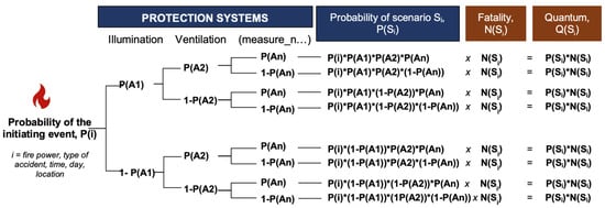 Quantitative characterisation of any single scenario is described in each branch of a tree diagram, as shown in Figure 2. The mortality rate assessment associated with each scenario is estimated through computational simulators (e.g., FDS, Evac, etc.), including deterministic tools that reproduce virtual scenario conditions that can be validated and verified.