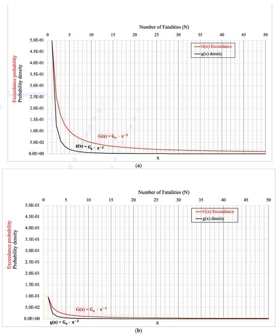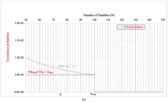 The numerical models of the scenario probability as g(N) functions and related exceedance probability G(N) are usually represented in a diagram on a logarithmic scale where on the horizontal axis, there are integer values of the number of fatalities (N) of the scenarios, and on the vertical axis, there is the probability of exceedance of the integer threshold values (Figure 4a).