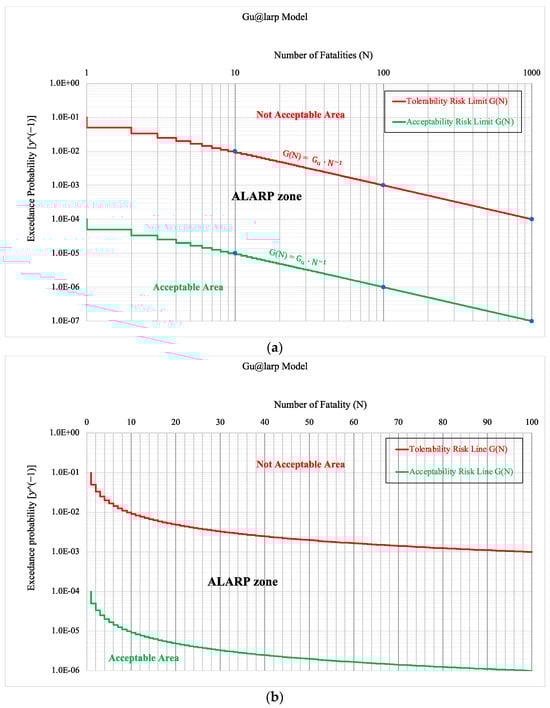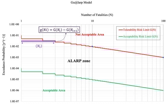 Here, we present our approach named as the Gu@larp model related to the ALARP principle adopted in the Italian Legislative Decree No. 264/2006 [47] in agreement with the Directive 2004/54/EC [4]. Here, in Table 1, Table 2 and Table 3, there are some examples of numerical values characterising the Tolerability and Acceptability Limit curves adopted in the Italian law [47].