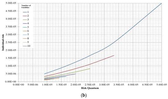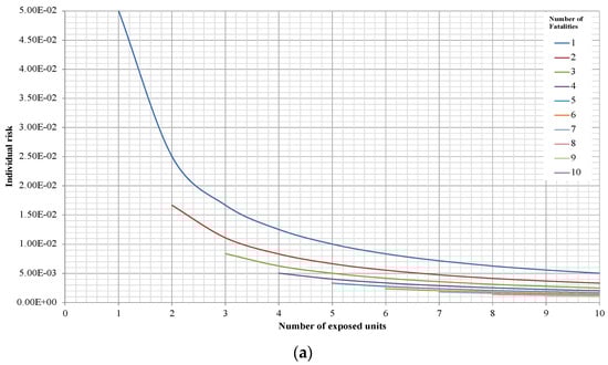 Figure 5a,b consider the number of fatality intervals from 0 to 10 with reference points given in Table 1. The Individual Risk is taken into account, and its behaviour is observable when considering the number of exposed people, parameterised by the number of fatalities, represented in different coloured lines. The Individual Risks show hyperbolic-type behaviour vs. exposed units, where the highest value corresponds to the minimum number of exposure units, which decreases monotonically as the number of exposed units increases.