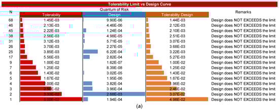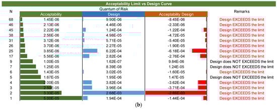 Ranking of the Risk Quantum of scenarios for the tolerable limit vs. design and their difference accordingly number of fatalities: (a) Tolerability limit curve; and (b) Acceptability limit curve.