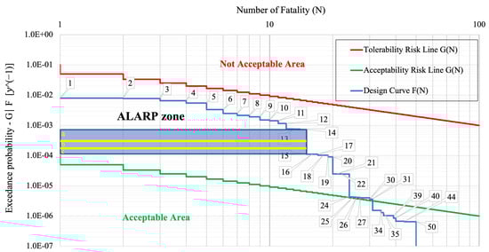 - Exceedance probability F(Ni), also named Societal Risk, is the Probability of the Union of Scenarios whose number of fatalities (N) exceeds a given threshold [38,39,40,41,42].