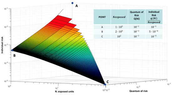 In Figure 10, we see a 3D view of the relationship, in a given Gu@larp model for the assumption of Gu = 10−1, between the Risk Quantum Q(Ni), the Individual Risk q(Ni/Nexposed) and the Number of Exposed units Nexposed. For a scenario with a given Risk Quantum, the corresponding Individual Risk shows a relationship inversely proportional to the number of exposed units.