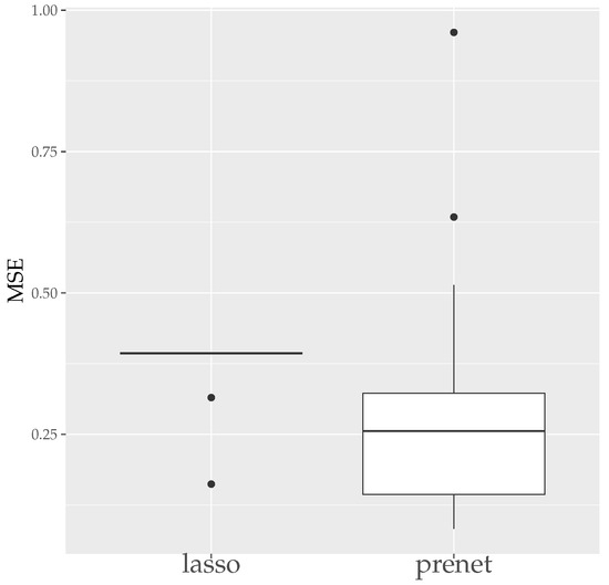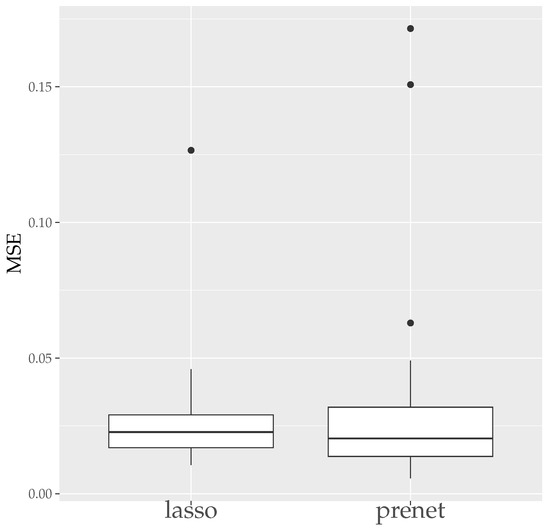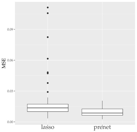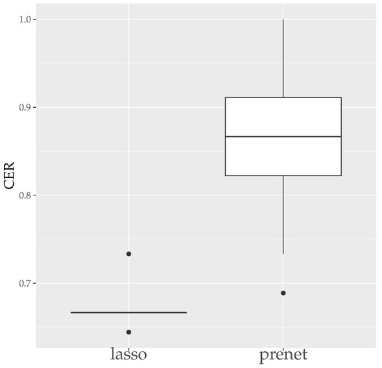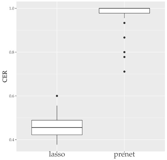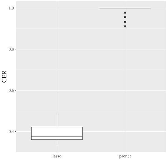 Finally, the boxplots of the Mean Error Rate (MER) and the Correct Estimation Rate (CER) for the estimation results generated 50 times with are shown in Figure 7 and Figure 8. As seen in Figure 7, unlike the case of , the estimation results by prenet are smaller and more stable compared to lasso when . Regarding the CER, while lasso is mostly unable to estimate the structure of , prenet can perfectly estimate the structure of in most cases, resulting in a CER of 1.