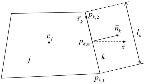 A cell j of the generalized quadrilateral mesh with as the cell center and as the center of edge k. The length of the edge k is . The two vertexes of edge k are and , and the unit normal and tangential vector are and , respectively [37].