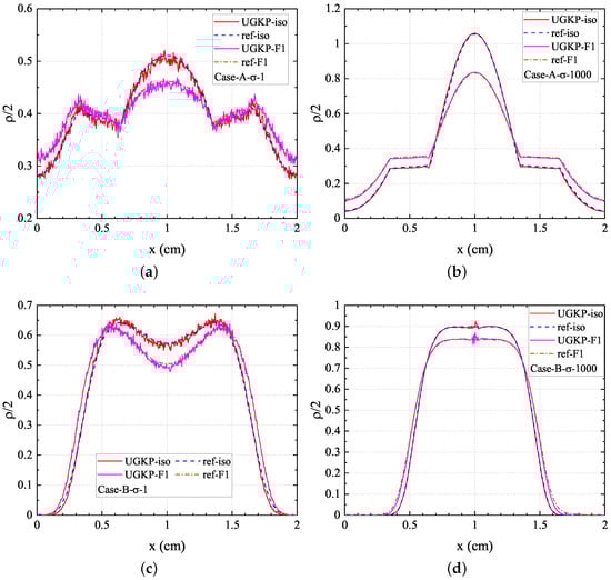 The isotropic scattering case is simulated first to verify the codes, whose results are given in Figure 2 and compared with the reference results in [42]. Subsequently, the anisotropic scattering case with the following F1 phase function is conducted to verify the anisotropic-UGKP method: