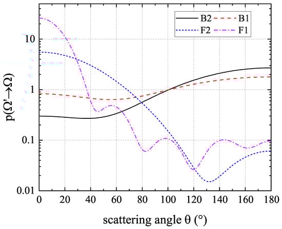 As indicated in Equation (40), the factor f ranges from 0 to 1 in the diffusion and free transport limit regimes, rendering the equivalent phase function (27) a multiscale phase function. The factor f equals 1 in the optically thin regime as . Thus, the equivalent multiscale phase function (27) aligns with the original phase function (19). With increasing, more frequent collision processes lead to a reduction in the anisotropy of the macroscopic scattering source, which is signified by the factor f decreasing. In the optically thick regime as , the factor f tends toward 0, causing all odd-order coefficients in (27) to approach 0. Therefore, the equivalent multiscale phase function (27) transforms into a phase function without any odd-order terms, preserving the isotropy of the macroscopic scattering source [41]. □