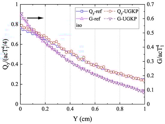 The normalized net heat flux in the y-direction and radiation intensity along the centerline are compared with the reference results in [43]. Figure 5 and Figure 6 show the results for isotropic and different anisotropic phase function cases, respectively. It can be clearly observed that the computational results from our anisotropic-UGKP method align closely with the reference results for all cases. Furthermore, the influence of the anisotropic scattering on the energy transfer is also clearly shown: the forward scattering phase function transports more radiation heat than the isotropic case, which leads to a flatter distribution of radiation intensity; meanwhile, less radiation heat is transferred with the backward scattering phase function compared with the isotropic case, causing a steeper distribution of radiation intensity. These results verify the accuracy of the anisotropic-UGKP method in modeling 2D anisotropic-scattering models.