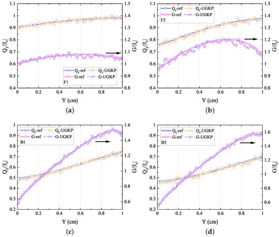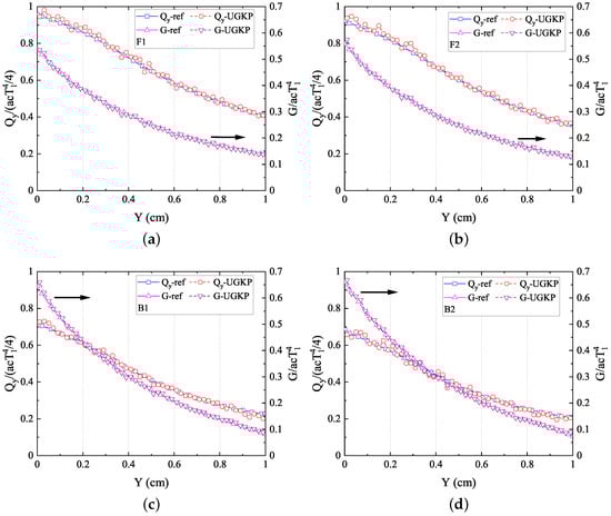 The normalized net heat flux in the y-direction and radiation intensity along the centerline for (a) F1 scattering, (b) F2 scattering, (c) B1 scattering, (d) B2 scattering compared with the reference results.