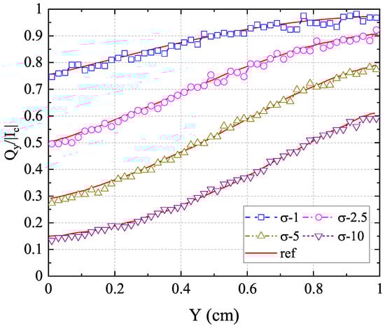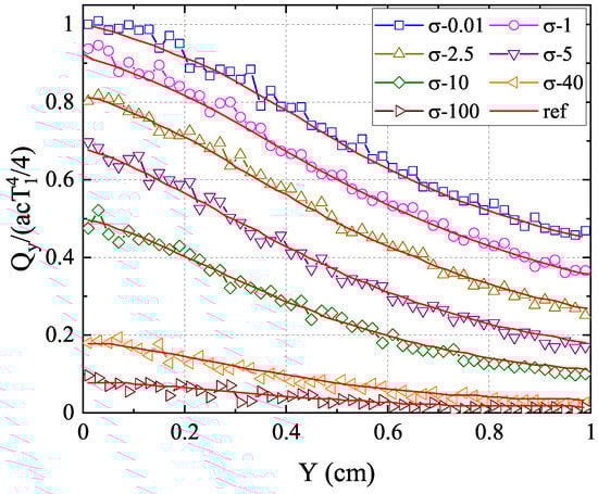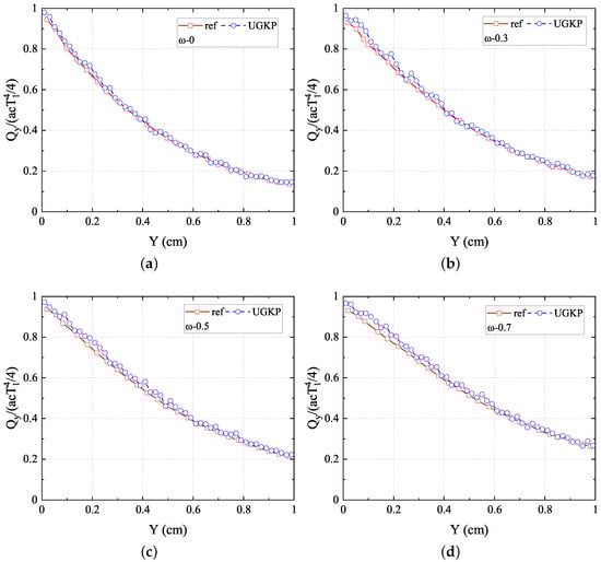 In addition, the F2 scattering case with varying cross-sections ranging from to 100 is simulated. The results of the normalized net heat flux in the y-direction along the centerline with different cross-sections are presented in Figure 7 compared with the reference results from [43] ∼ and [44]∼. As can be seen, the results of the anisotropic-UGKP method agree well with the reference results for all cases. Furthermore, Figure 8 displays the normalized net heat flux in the y-direction along the centerline with different scattering albedos , which also shows good agreement with the reference results in [43]. With , the energy absorption reduces the radiative heat transfer, which leads to the steepest distribution of . The absorption process becomes less important with increasing, causing a flatter distribution. The above results confirm the capability of the present anisotropic-UGKP method in simulating the absorbing and anisotropic scattering systems of all regimes.