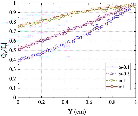 The normalized net heat flux in the y-direction along the centerline with F2 scattering and different albedos compared with the reference results.