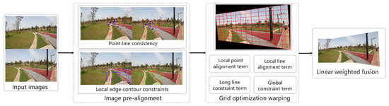 Workflow of the image stitching algorithm introduced in this paper. The stitching process is divided into three stages, including image pre-alignment, grid optimization warping and image fusion.