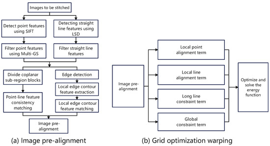 Workflow of the image stitching algorithm introduced in this paper. Flowchart (a) and flowchart (b) are detailed expansions of the image pre-alignment stage and grid optimization warping stage respectively.