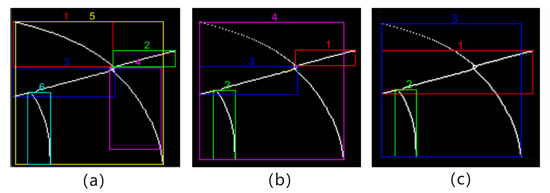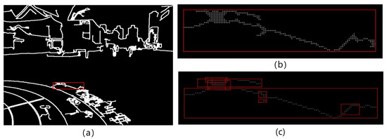 For each local edge object, the “crawler” method is used in contour tracking to perform separation operations in the X and Y axes. A point storage matrix needs to be created for the isolated new local edge contour. The starting point is freely selected along the left boundary of the bounding box and is placed into the point storage matrix for initialization. For each unit length along the x-axis direction, the Euclidean distance between the y-value point and the last point in the point storage matrix is calculated to measure its proximity to the last point in the current point storage matrix. A point distance threshold is established, and the calculated Euclidean distances are compared with the point distance threshold. If the distance is less than the threshold, the point is included in the point storage matrix; otherwise, it continues to move forward to explore the next unit point. If a suitable point cannot be found for three consecutive times, the point set in the point storage matrix is considered to be a new local edge object. At the same time, the point set of the separated local edge object is removed from the point set of the old local edge object. Subsequently, the minimum bounding rectangle of the newly recalculated local edge objects is determined. This process is iterated until the point set of the old local edge object is empty. The above is the operation of separating local edge objects in the X-axis direction, and the principle is the same in the Y-axis direction. Finally, a collection of local edge objects in the X and Y directions is obtained. Figure 5 illustrates the process of separating a local edge object (red box) in the X direction to generate multiple local edge objects.