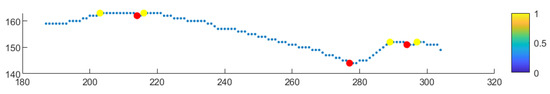 The obtained local edge objects undergo direction-specific local peak detection along the coaxial directions during separation along the X and Y directions. This is because the outline structure of most local edge objects does not conform to the quadratic curve, such as the entire curve structure in Figure 6. It is necessary to detect the contour structure conforming to the quadratic curve from the curved structure and peel it off. Obviously, the more complex curve structure contains more peak points. The method of local extremum detection is employed to precisely identify peaks within the curve structure. Figure 6 is the result of peak detection on the curve structure of the largest edge separated in the X direction in Figure 5c. The curve structure of this maximum edge is represented as . Then, represents the y value of the point set in the curve structure, and the peak point is calculated through the following formula: