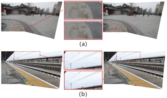 Figure 9 is the visual comparison of the results of the ablation experiments of the two contrast experiments. The stitched images are obtained from the classic datasets, APAP-railtracks and RailStation, respectively. It is found that the stitching method based on point-line consistency and contour feature constraint can achieve precise registration and alignment better than the point-line feature matching method based on local block point-line consistency constraint extraction. In Figure 9a,b, the left figure shows the result of stitching based on point-line consistency, and the right figure shows the result of stitching based on point-line consistency and contour feature constraints. In (a), the left figure is not aligned and artifacts occur, while the right image, constrained by contour features, exhibits a significantly improved alignment with no artifacts. In (b), the enlargement of the section within the red box in the left image reveals disruptive noise and artifacts in the stitching result, whereas the right image, incorporating contour feature constraints proposed in this paper, demonstrates a notable enhancement in the alignment of line contours when compared to the left image.