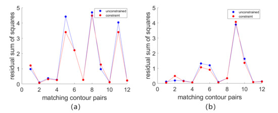 Residual sum of squares calculated for contour matching pairs after warping and fitting. The x-axis represents the contour matching pairs, and the y-axis represents the calculated residual sum of squares. (a) is the fitting result of the local edge contour features detected on dataset a in Figure 9. (b) is the fitting result of the local edge contour features detected on dataset b in Figure 9.