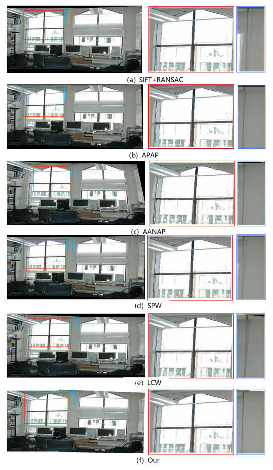 From the effect comparison in Figure 12, it can be observed that the SIFT+RANSAC, APAP, AANAP, SPW and LCP algorithms maintain the original outline of the building in the overall visual feel of the panorama, but their performance in local details is not satisfactory. In particular, there is obvious misalignment and ghosting in the alignment effect on the glass railings, and a certain degree of distortion at the edges. In comparison, the algorithm proposed in this article has almost no obvious ghosting phenomenon in the splicing results, and the distortion of the railing edges is slighter, making the splicing results clearer.
