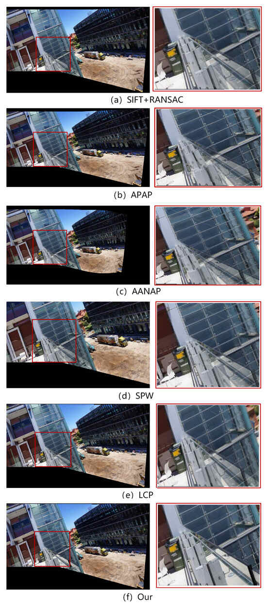 In this experiment, SIFT+RANSAC, APAP, AANAP, SPW, and LCP are selected for visual evaluation. The dataset grail is used. The following image is the test result of the preceding algorithms on the dataset.