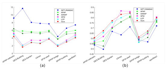 Matching point added by point-line consistency [12] and matching feature point extracted by SIFT are merged into matching point pair data , which represents the input N sets of data. Multi-GS [26] is used to filter interior points, and M fitting model parameter sets are generated by random sampling. We assume a local edge contour feature pair , where j represents the identifiers for the local edge contour feature pair. For each hypothetical model, first, we calculate distance between the two transformed local edge contour feature pairs, which is obtained by Formula (3). The required edge distance is also the error value of the local edge contour feature pair under this model. Second, distance error sum of all local edge contour feature pairs is calculated. The distance error sums of local edge contour feature pairs under all model assumptions are sorted from small to large to obtain an ordered list . Third, mean square error is calculated for the sum of error distances for all pairs of local edge contour features in a single model hypothesis. Next, it is necessary to calculate mean error value of all local edge contour feature pairs, and sort the obtained results from small to large. This is to rule out hypothetical models in which the overall alignment is affected because a single local edge contour feature is severely misaligned. The formula is expressed as