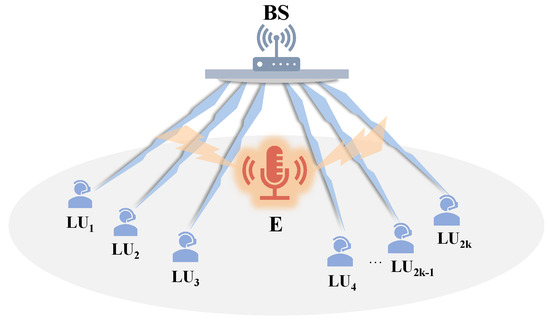 We investigate a downlink NOMA system utilizing one base station (BS), legitimate users, and one external eavesdropper (E), as illustrated in Figure 1. We presume that each node is equipped with a single antenna, as in [16,19,20,22], all wireless channels include Rayleigh block fading [16,22,23], and the communication channel gains from the base station to the legitimate user i (denoted by ) and the eavesdropper are denoted by , (), and . Generally, we make the assumption that the channel gains of users adhere to the sequence . We also presume that both users and the eavesdropper experience equivalent levels of noise power, denoted as .