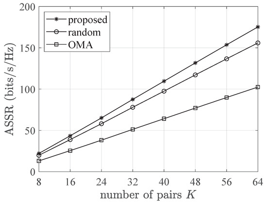 Figure 2 shows a performance comparison of the ASSRs between an NOMA with the proposed UP and PA scheme (proposed), and the two benchmark schemes, randomly paired NOMA with optimal PA and standard OMA, with different numbers of user pairs where dB. From Figure 2, it can be inferred that averaged performance of the ASSRs in the NOMA scheme (both optimal pairing and random pairing) outperformed that in the OMA scheme, and the ASSR was a function of the quantity of user pairs. When K was small, the performance difference of the ASSR was not obvious between the NOMA scheme with optimal pairing and that with random pairing. However, with the increase in K, the ASSR of the proposed scheme gradually exceeded that of the rival method owing to the optimality we reached.
