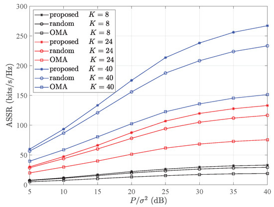 In Figure 3, a comparison of the ASSRs among an NOMA employing the proposed optimal UP and PA scheme (proposed), a randomly paired NOMA with an optimal PA, and an OMA are shown in different colors and markers, with varying signal–noise ratios (SNRs) for different numbers of user pairs. It can be observed that with the rise in the SNR, the ASSR proportionally improved. At low SNR values, the difference in the ASSR performance between the NOMA scheme with optimal pairing and that with random pairing was not significant. However, as the SNR escalated, the superiority of our method’s ASSR became more evident. Furthermore, as the quantity of user pairs (K) grew, the superiority of the ASSRs over the other two schemes became increasingly apparent.