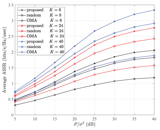Figure 4 illustrates the average ASSRs (average ASSRs per user, i.e., ASSR/N) employing our proposed Optimal UP and PA scheme. The data points are represented using various colors and markers, indicating different signal–noise ratios (SNRs) for varying numbers of user pairs. From Figure 4, we can see the following three aspects. Initially, as the SNR rose, the average ASSR followed a corresponding increase. Secondly, our method outperformed competitors in terms of the average ASSR. Lastly, enhancing the number of pairs (K) resulted in even greater performance improvements in the average ASSR. Compared to Figure 3, as the quantity of user pairs (K) grew, the improvement in the performance of the average ASSR became more significant than that of the ASSR.