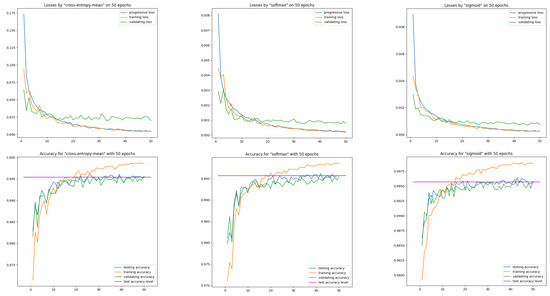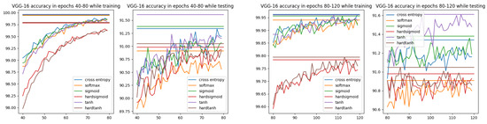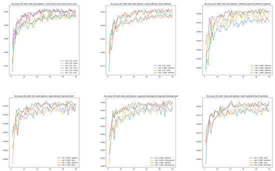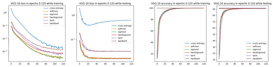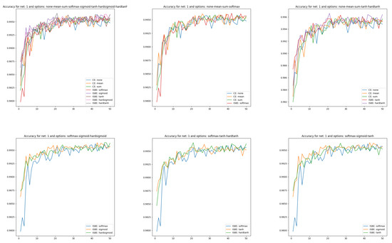- In the first subsection of the fourth section, using the example of the problem of recognizing handwritten digits and the standard MNIST(60K) image collection [25], numerous experiments show that in addition to the obvious savings in computational resources, in the case of five activations serving as normalization functions, the classifier’s effectiveness is not lower than that of the combination of the normalization SoftMax and Cross Entropy. This ISBE property was verified for the activation units SoftMax, Sigmoid, Hardsigmoid, and Tanh and Hardtanh. The second subsection of the fourth section reports on how ISBE behaves for a more demanding dataset CIFAR-10 and a more complex architecture VGG-16.